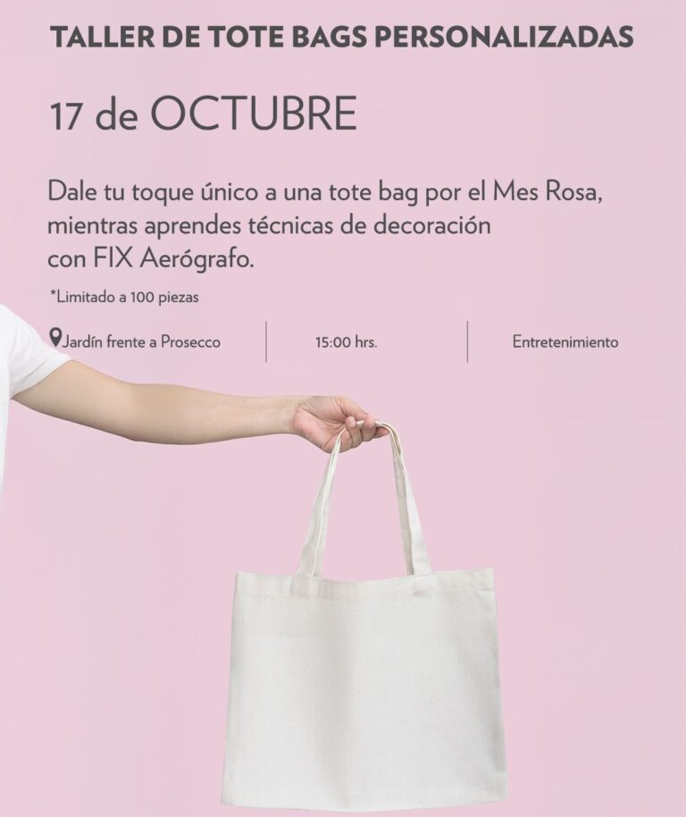 El 17 de octubre a las 3:00 p.m. en Prosecco, participa en un taller creativo guiado por FIX Aerógrafo, donde podrás diseñar y personalizar tu propia tote bag con tu estilo y colores favoritos.